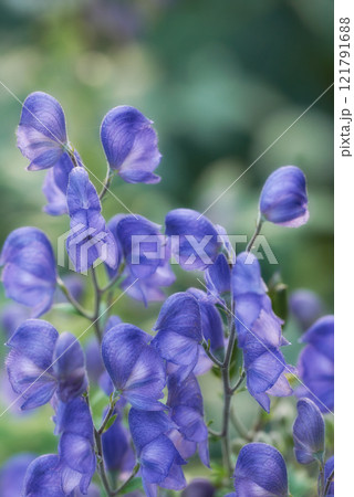 Closeup of blue aconite flowers growing, blossoming and flowering as a herbal and medicinal plant for traditional homeopathy. Bunch of vibrant little plants blooming on a bush or shrub in home garden
