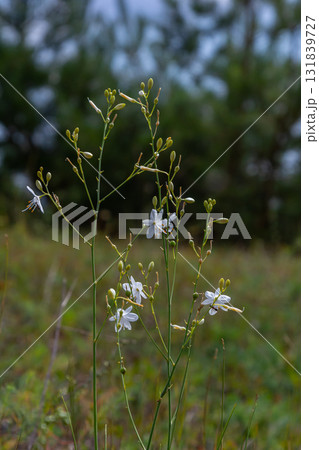 Fragile white and yellow flowers of Anthericum ramosum, star-shaped, growing in a meadow in the wild, blurred green background, warm colors, bright and sunny summer day