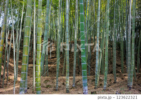 木漏れ日に照らされた真竹を見上げる(縦長)