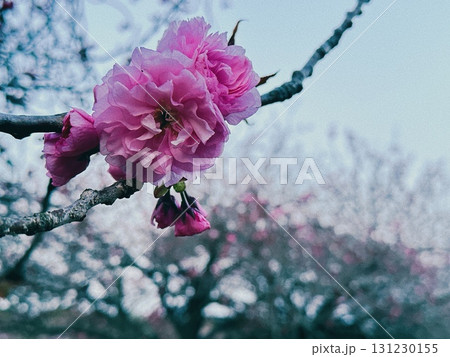梅の花とつぼみ、梅、ピンクの梅をバックに