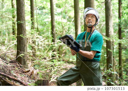 森林を管理する作業員の男性 林業 森林官 自然保護官 イメージ