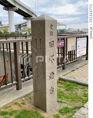 海を背景にした堺のシンボル、日本最古の木造洋式灯台の石碑 旧堺燈台