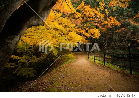 沢伝いに紅葉した木々 晩秋の榛名神社二の鳥居付近