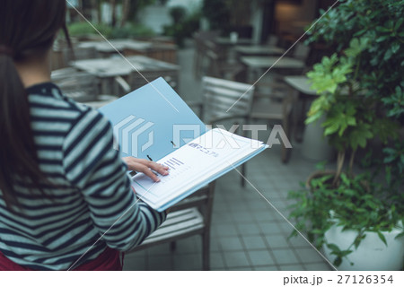 書類を確認する女性 手続き 資料 コピースペース 16:9