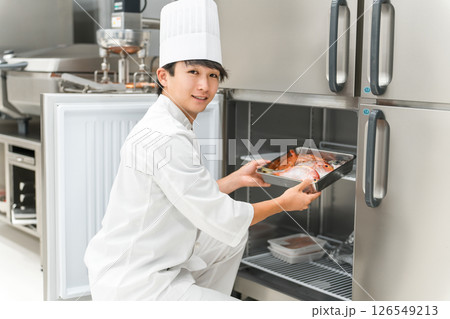 冷蔵庫から食材を取り出すコックコート姿のシェフの男性