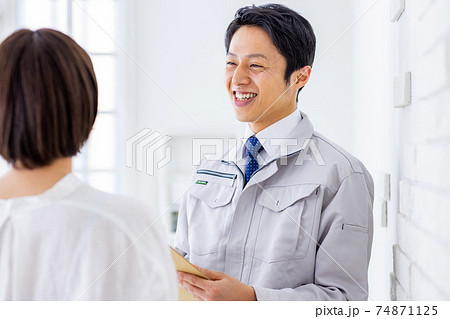自宅を訪問する作業服姿の男性ビジネスマン(住まい・建築・修理)