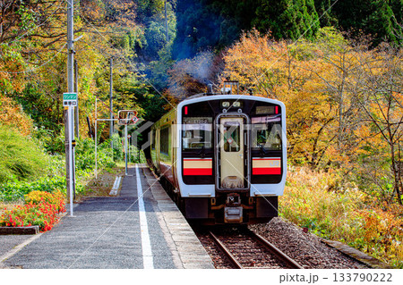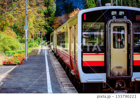 只見線 秋の早戸駅を出発する列車(福島県三島町、11月上旬午後)