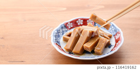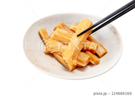 皿に盛った極太のメンマ【白背景・切り抜き】