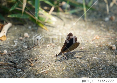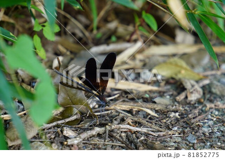 水辺の石の上で羽を広げて止まるハグロトンボ