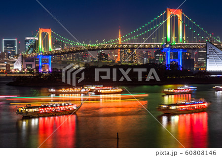 東京都 お台場海浜公園から見えるレインボーブリッジと屋形船の浮かぶ東京湾の夜景