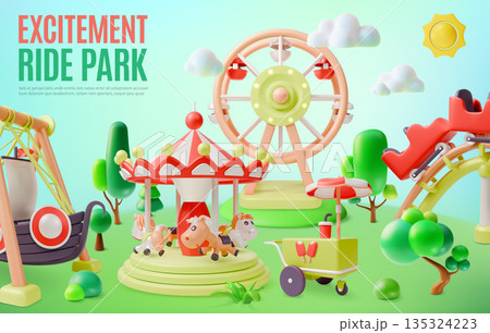 3d Excitement Ride Amusement Park Concept Ads Banner Poster Card Cartoon Design Style. Vector illustration of Outdoor Entertainment at Summer Holiday