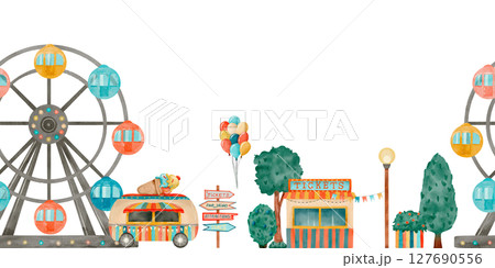 Watercolor Vintage Carousel, Colorful Balloons and Delightful Ice Cream