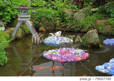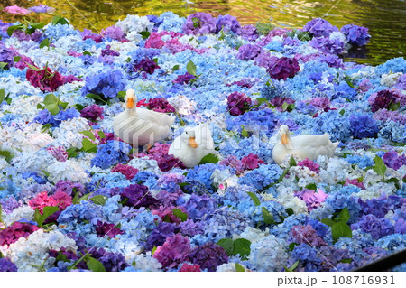 茨城県桜川市本木 雨引山楽法寺 雨引観音の池の色とりどりの水中花あじさいとその上で遊ぶアヒルの群れ