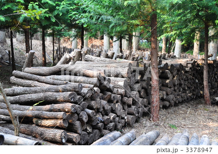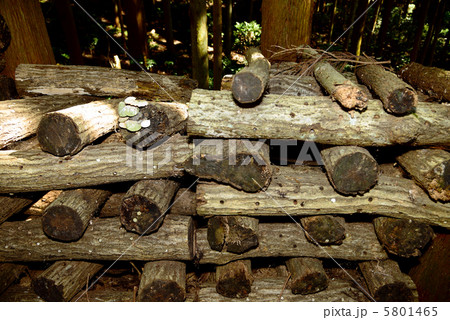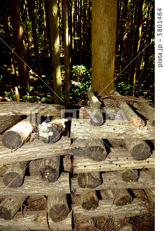 シイタケの人工栽培 / コナラの木の原木栽培 / 伐採乾燥したコナラの原木にシイタケ菌を植える