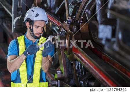 Engineer checking construction process railway and checking work on railroad station .