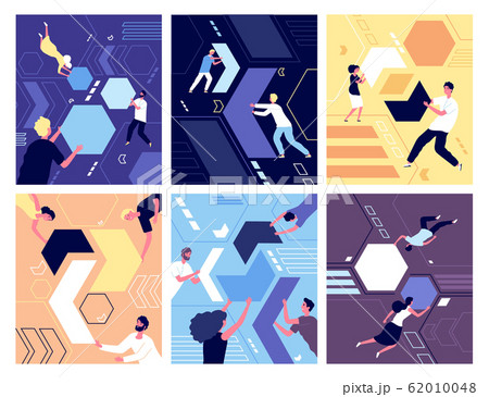 Collecting geometric shapes. People shaping puzzles. Success partnership, abstract working characters and leadership. Team vector concept