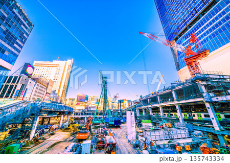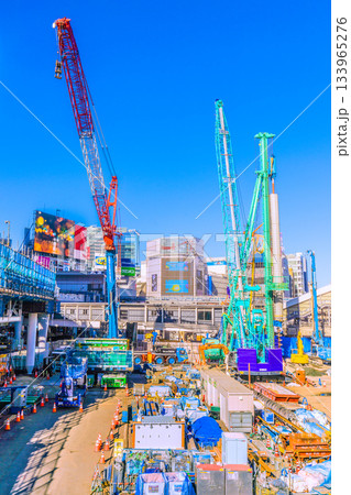 日本の東京都市景観1月23日。渋谷駅西口上空施設新築計画…クローラークレーンなどの巨大重機がズラリ…