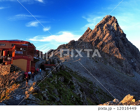 北穂高小屋のテラスから見る早朝の槍ヶ岳 北アルプスの北穂高岳登山
