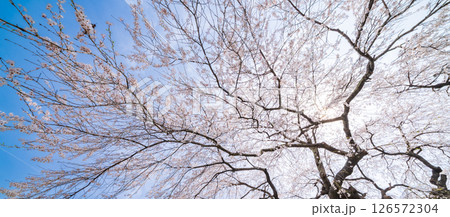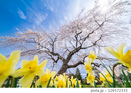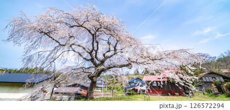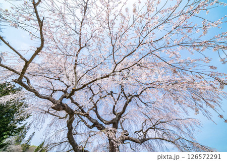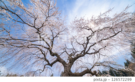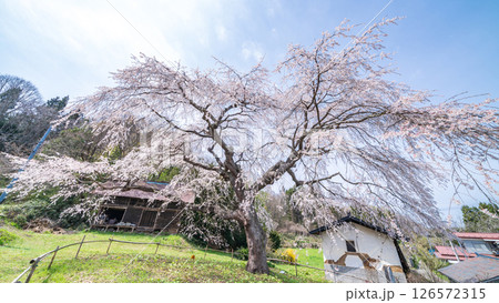 「青森県」春空と槍沢の枝垂れ桜 五戸町