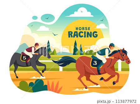 Horse Racing Competition in a Racecourse with Equestrian Performance Sport and Rider or Jockeys on Flat Cartoon Hand Drawn Templates Illustration