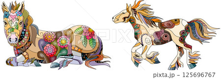 Zentangle galloping horse. Hand drawn decorative vector illustration for coloring. Color and outline set