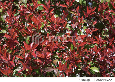 春の陽射しを浴びて輝く赤い葉のオオバベニガシワ