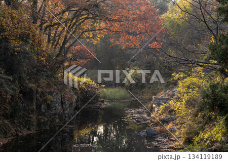 紅葉と岩肌が彩る嵐山渓谷を静かに流れる槻川