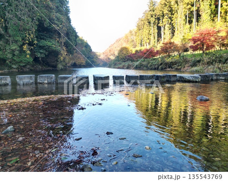 埼玉県嵐山町 紅葉の武蔵嵐山渓谷槻川の飛び石に紅葉の倒影