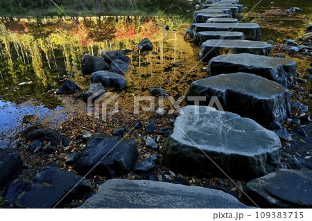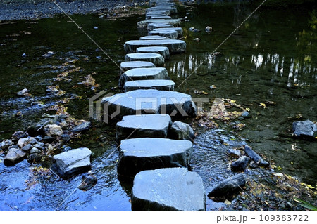 埼玉県嵐山町 紅葉の武蔵嵐山渓谷槻川の飛び石に紅葉の倒影
