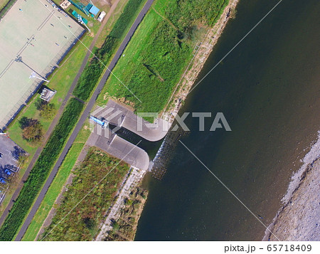 多摩川の「樋門」〜ドローンで空撮(東京都立川市錦町5丁目)