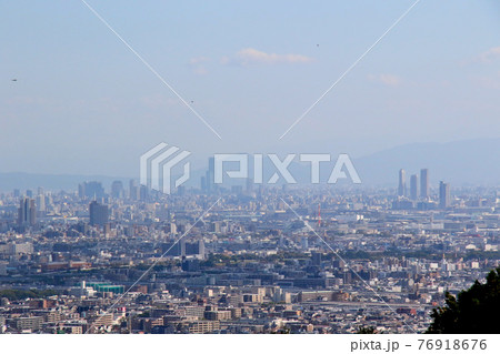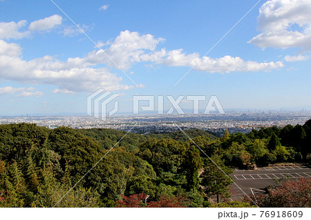 甲山の南側の山麓に位置する甲山大師神呪寺の展望台から青空の下、大阪平野を望む