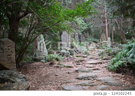 Zao mountain Yamagata Japan, Mountain path with rocky terrain and distant hills.