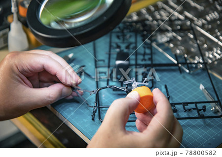 プラスモデルのオートバイを接着剤で組み立てる手のアップ