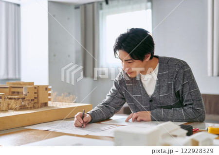 建築模型の置かれたデスクで設計図を確認し作図しながら設計を行う建築士の男性
