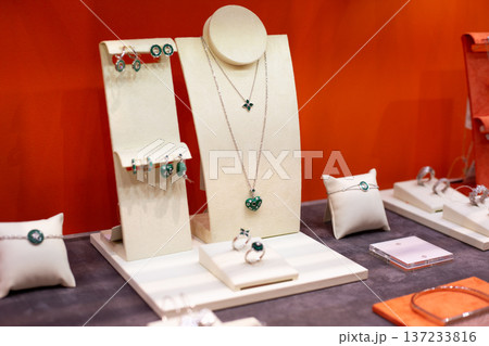 Green jewelry made with artificial gemstones on display at jewelry store. Store specializes in fake jewelry. Synthetic gemstone in jewelry on shelf. Transition from real diamonds to synthetic