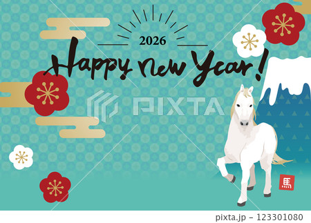 2026年 年賀状横デザイン 馬と富士山のイラスト