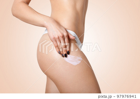 Wellness, wellbeing, vitality concept. Sideways shot of slim woman applies cream on hip, has flawless skin, wears white panties, isolated over beige background, cares of body, has naked torso