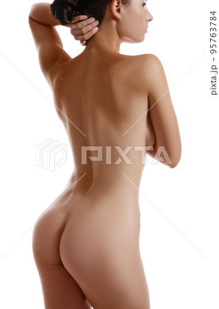 Perfect, nude body of a girl covering her breast with hands posing isolated on white. Plastic surgery and aesthetic cosmetology concept. Close-up.