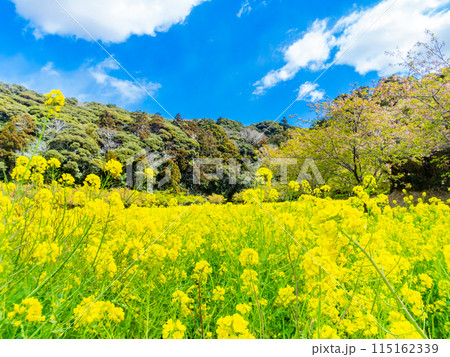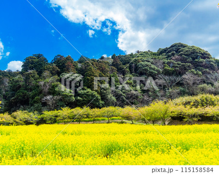 千葉県岩井の堰の美しい春景色 満開の菜の花と河津桜