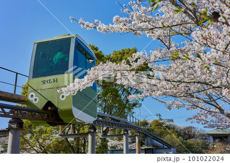 丸岡公園 満開の桜とスロープカー(宝くじ号)