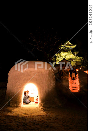 秋田県横手市のかまくら祭り 雪景色のかまくらと横手城