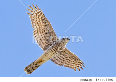 尾羽と翼を広げて方向転換するハイタカ幼鳥
