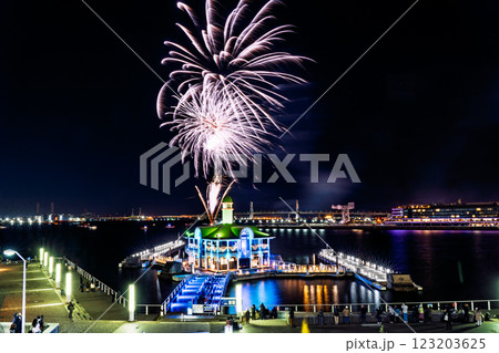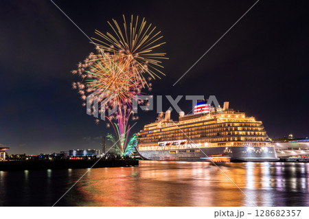 《神奈川県》打上花火と豪華客船・横浜象の鼻パーク