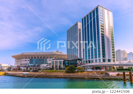 日本の横浜都市景観 みなとみらいのKアリーナと隣接するヒルトン横浜などを望む