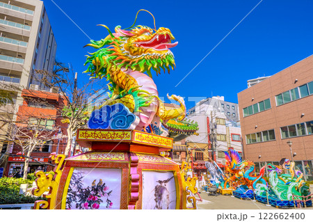 日本の横浜都市景観7年1月。2025春節燈花。山下町公園・「會芳亭」前に聖獣がズラリ…=22日