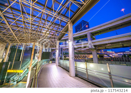 日本の横浜都市景観 11月。早朝の桜木町駅 南改札(東口)や電車、健康福祉総合センターなど=3日