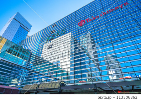 日本の横浜都市景観 11月・横浜タカシマヤや窓ガラスに映る横浜駅やJR横浜タワーなどを望む