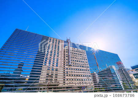日本の横浜都市景観 中央西口駅前広場から横浜駅や太陽光などを望む。新時代に希望の光…