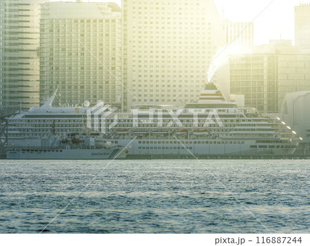 横浜港に停泊中のクルーズ船とみなとみらいのビル群 / Yokohama, Japan