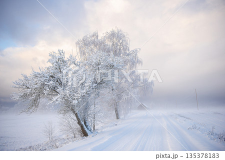 Snowy Country Road Lined With Frosted Trees in Morning Haze